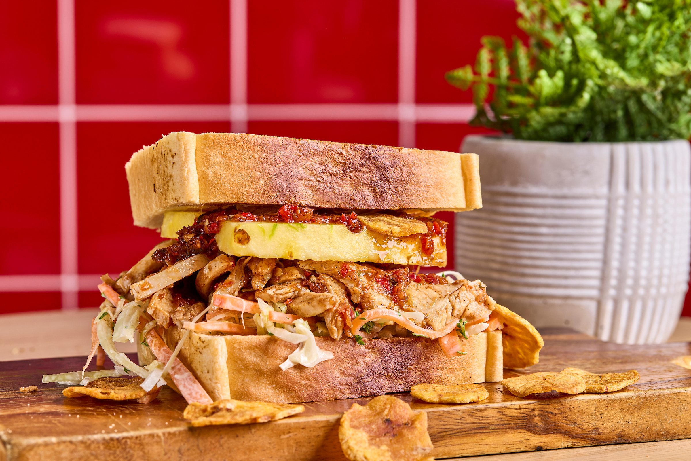NOT FOR THE FAINT HEARTED…Spicy Caribbean chilli chicken on a white bloomer with slaw, charred pineapple and plantain crisps.